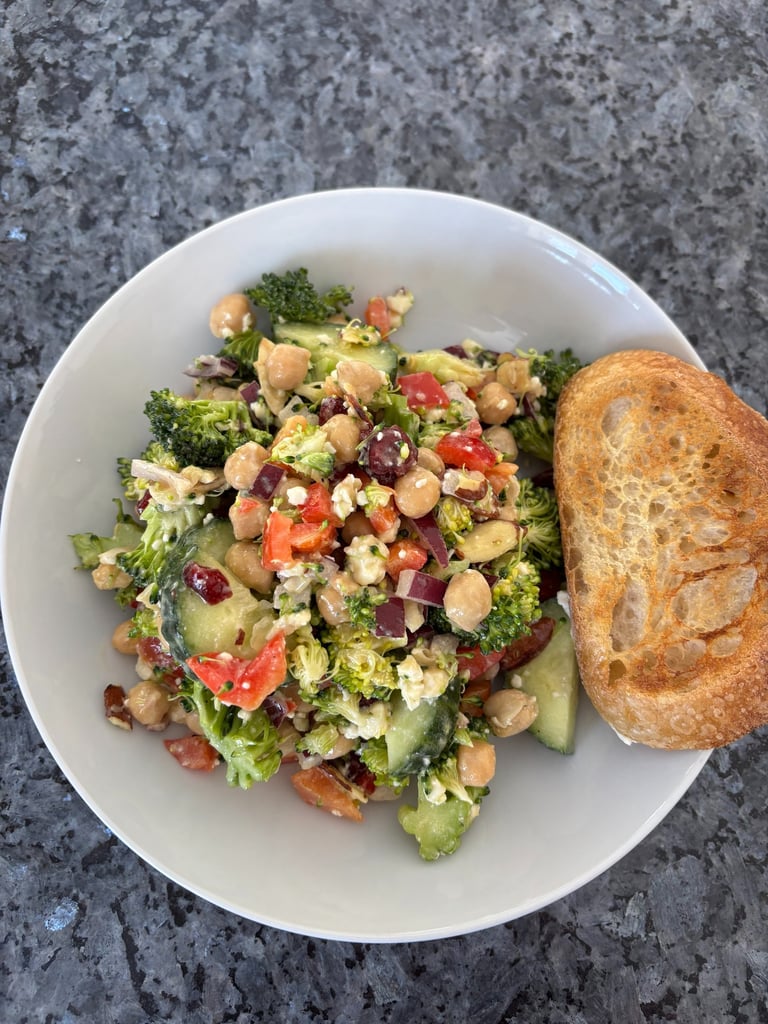1. In a large bowl, combine the chopped broccoli, bell pepper, red onion, apple slices, chickpeas, Gorgonzola cheese, and almond-cranberry topping. Drizzle with the lemon juice and toss to mix.