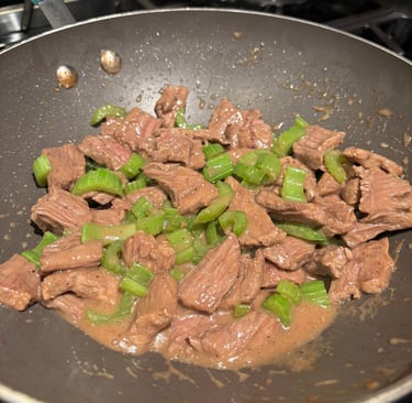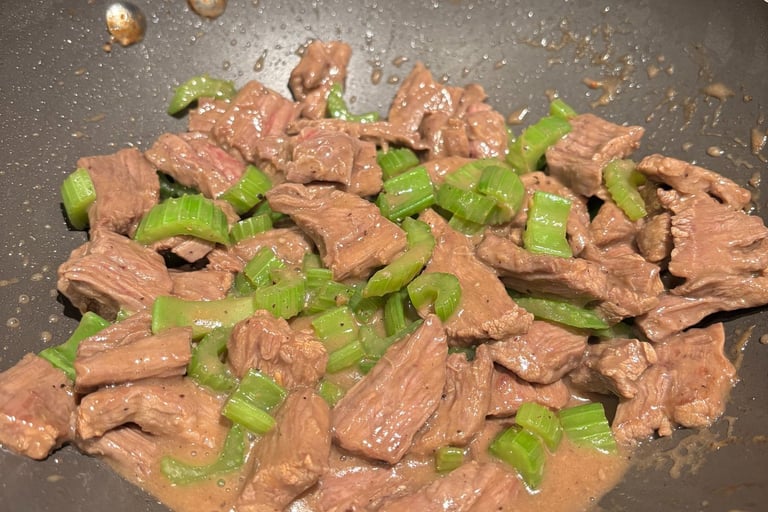 In a bowl, combine the sliced flank steak with soy sauce, 1 tablespoon of peanut oil, sugar, and cornstarch. Mix well and set aside to marinate while preparing other ingredients.Cook the Celery: